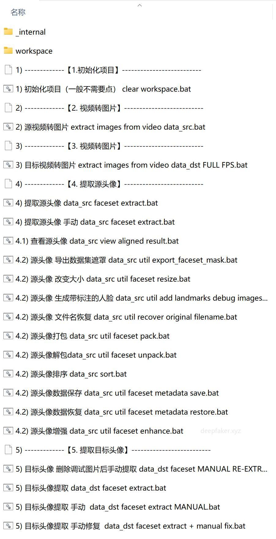 这些 .bat 文件 就是 DeepFaceLab 的核心操作脚本,每个文件对应一个功能,双击即可运行。