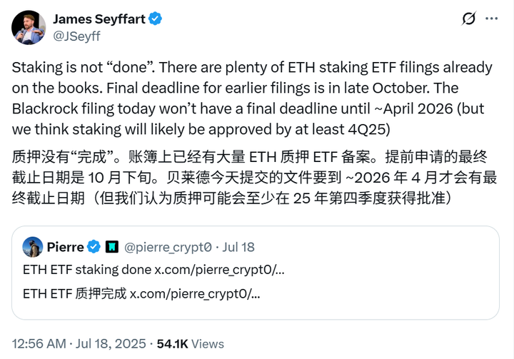 贝莱德已开始探索包含质押的结构,提交了修订后的19b-4文件,**明确提到质押作为“潜在未来功能”,但需等待监管批准。**专家预测,ETF质押可能在今年最后一季度获批。市场制造和交易公司Wintermute去年曾指出,缺乏质押机制削弱了以太坊作为ETF工具的吸引力。若宏观环境发生变化,以太坊的稀缺性、质押收益和ETF及托管的可访问性将使其成为极具吸引力的选择。