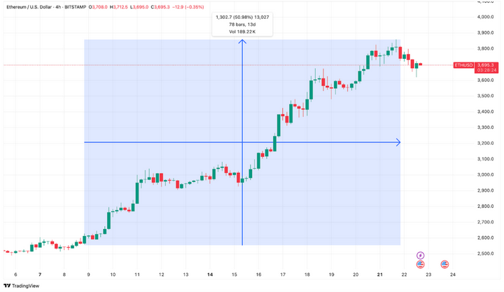 以太坊价格已与机构活动同步上涨,过去两周飙升超50%,创下2025年新高,近三个月累计上涨150%。**ETF发行新股份时需购买以太坊,这将锁定供应,减少市场可用以太坊,推高价格。**国库建设者将以太坊定位为可编程抵押品——一种能够产生收益、提供安全保障并长期持有的资产。